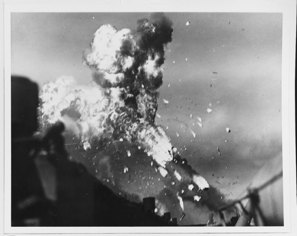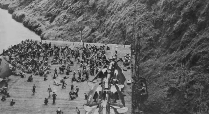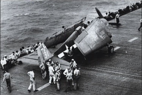 Walworth signaled his readiness to land and took a lap around the carrier, flying downwind on the port side of the ship before turning 180 degrees and getting into the groove behind her. Intrepid no longer looked like a stamp but a veritable city sprawling out before him. Waiting on his platform on the back end of the carrier was Intrepid’s Landing Signal Officer (LSO), Lt. Richard “Rit” Moot. He watched Walworth’s jerky approach probably with consternation at first, then with increasing concern. As the pilot bled off speed and began to descend towards the deck, Moot gave him the wave off. Walworth’s approach was too fast and too high. He’d crash coming in like that. As Walworth pulled back on the stick and climbed for altitude for a second pass, Lt. Moot saw the gaping hole in Walworth’s plane. He knew in a flash that the pilot wouldn’t get a third chance.