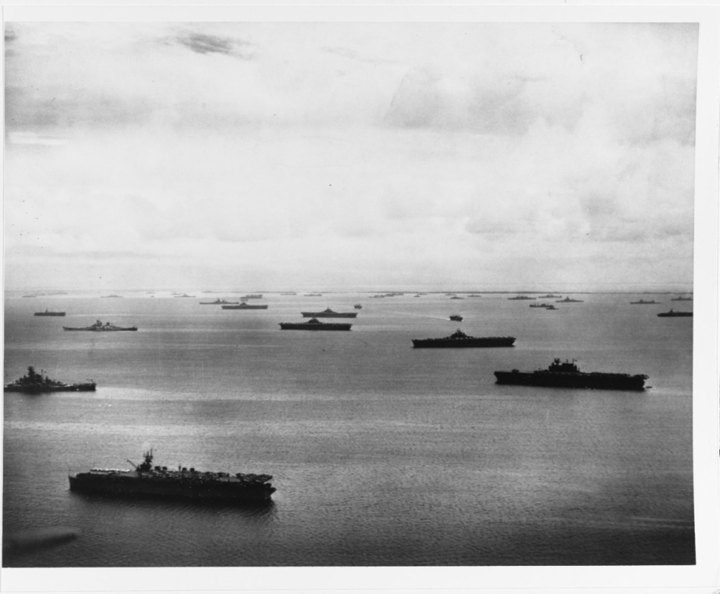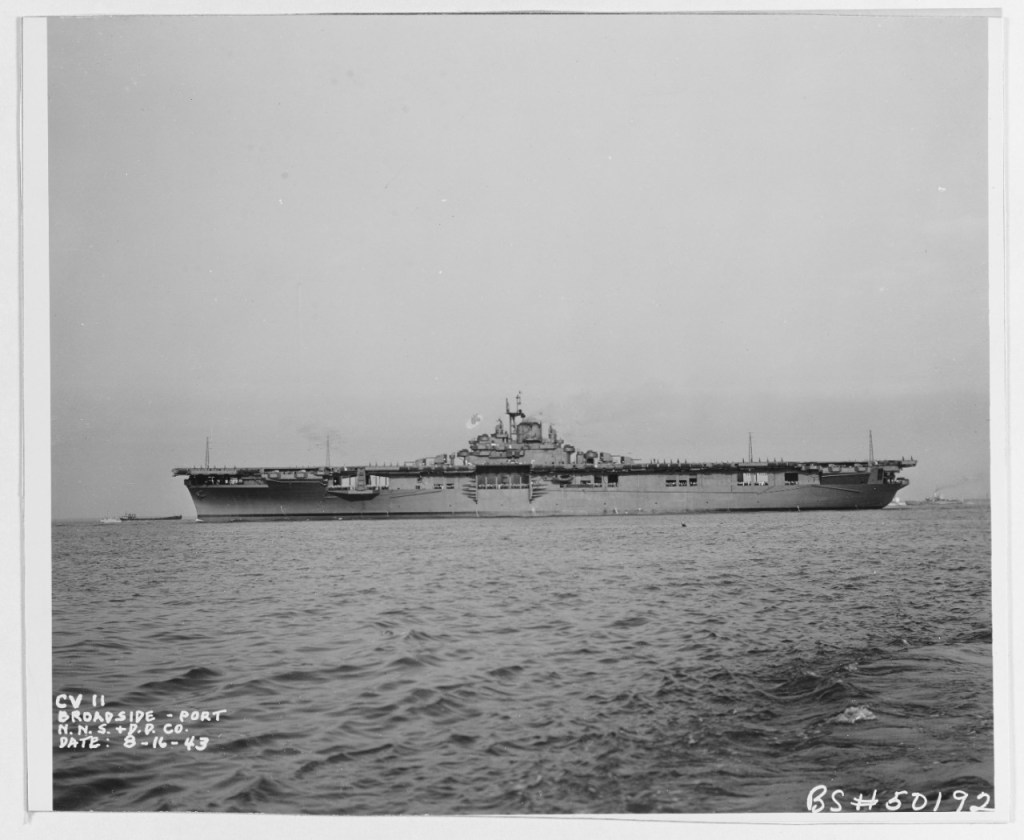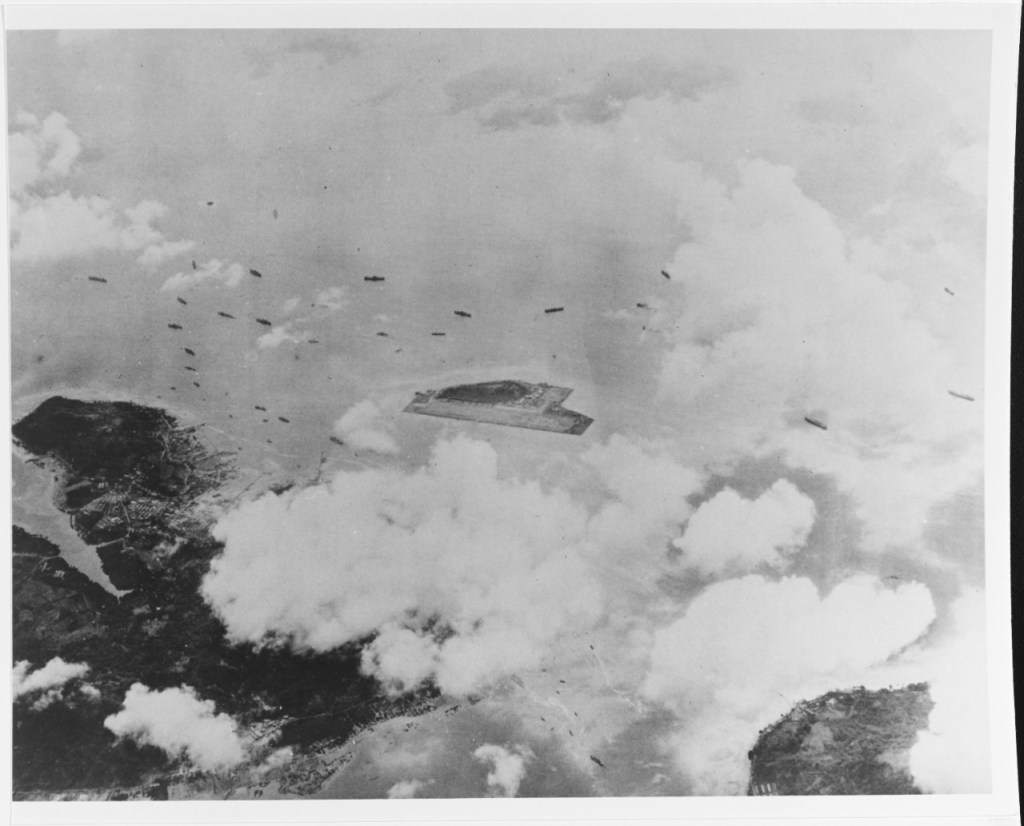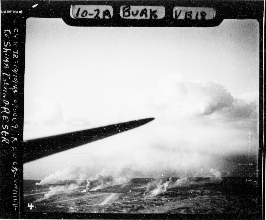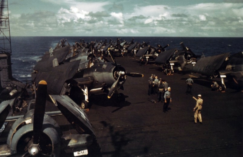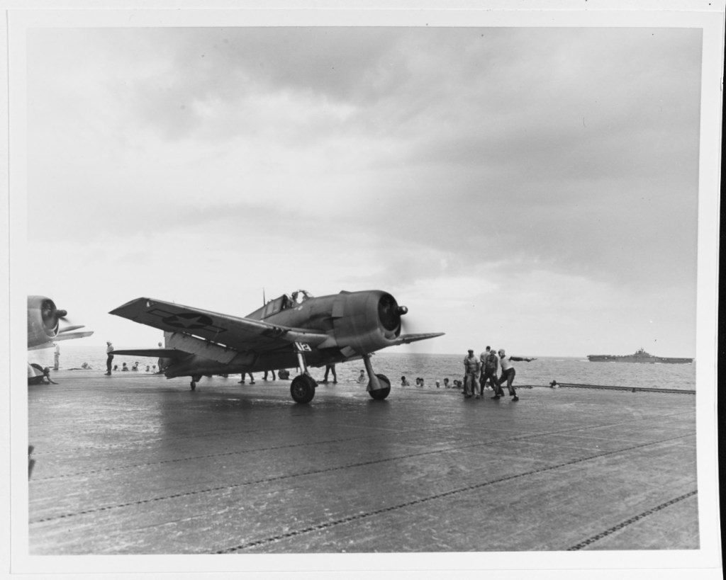 The wakes of the destroyers and other outlying ships of Task Group 38.2 must have been a beautiful sight to Walworth, whose arms no doubt grew increasingly sore with each push and pull of the stick. The little specks on the horizon slowly grew into definite shapes, including the most blessed view imaginable at that point, the rectangular flight deck of Intrepid. At that altitude and distance it still looked like a postage stamp framed by an endless blue background of ocean.