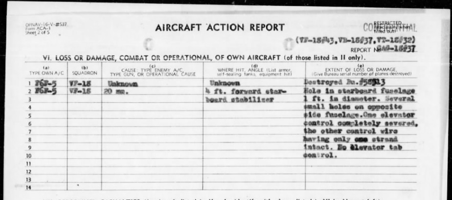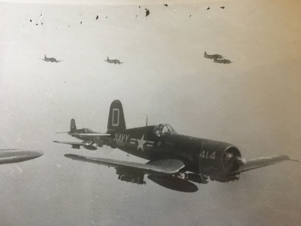 Wally’s squadron mates in Fighting 18 radioed him to make sure he was okay but otherwise kept the channel free of chatter. Part of this was due to the squadron’s excellent radio discipline. The other part had more to do with Wally’s predicament. They could see what he could not: a gaping, one-foot-wide hole blown in the starboard side of his plane. Light poured through multiple smaller holes on the opposite side where shrapnel cut clean through his aircraft. But at that moment, Wally needed to focus on getting back home in one piece. Knowing the long odds he faced would just distract him.