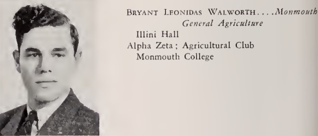 Bryant Leonidas Walworth was born July 22, 1919, in Martinsville, Illinois. His striking name came from an institution that served as a sort of focal point for the Walworth family: the University of Illinois. Bryant’s father, Edward, graduated from Illinois with a degree in agronomy and later taught at the school. Edward held the head of the agronomy department, William Leonidas Burlison, in such high regard that he borrowed his middle name for his son. Edward was also very active in campus religious life. He led Baptist youth services and maintained a close connection to Reverend Martin S. Bryant, who catered to the spiritual needs of the University’s Baptist population. Hence Bryant Walworth’s first name.